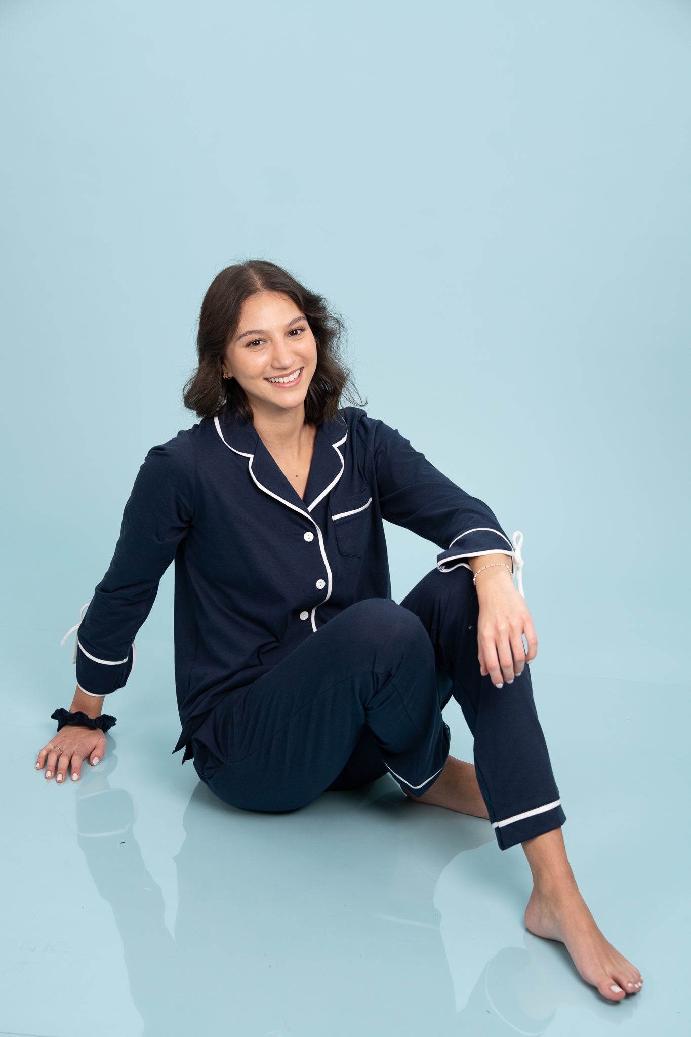Pijama Camisera Bow Blue 2 piezas , blusa manga larga , y pantalon con bolsas
